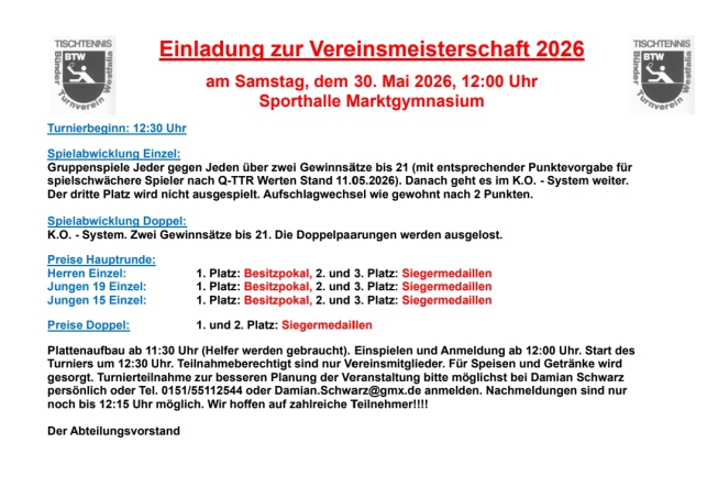 Bitte Termin für die Jahreshauptversammlung am 11.5.2026, 18.30 Uhr, vormerken. Einladung JHV nachstehend.