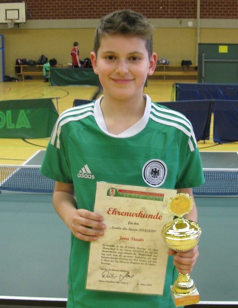Die Auszeichnung als Spieler der Saison 2013/14 erhielt diesmal der Schüler Jona Staats. Er erreichte in der B-Schüler-Kreisliga mit seiner Mannschaft bei nur drei Unentschieden ungeschlagen die Meisterschaft und lag nach Ende der gesamten Spielsaison mit einer beeindruckenden Leistung von 31 Siegen und nur 6 Niederlagen auf dem 3. Platz der Top-Bilanzen-Rangliste sämtlicher Spieler der B-Schüler-Kreisliga des TT-Kreises Herford.