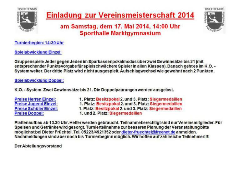 Am Samstag, 17.5.2014, fanden in der Sporthalle des Gymnasiums am Markt die alljährlichen Vereinsmeisterschaften der Tischtennisabteilung statt. Traditionsgemäß wurde in Gruppen gespielt, wobei die spielstärkeren Spieler den spielschwächeren gewisse Punktevorgaben geben mussten. Danach ging es im KO-System weiter.