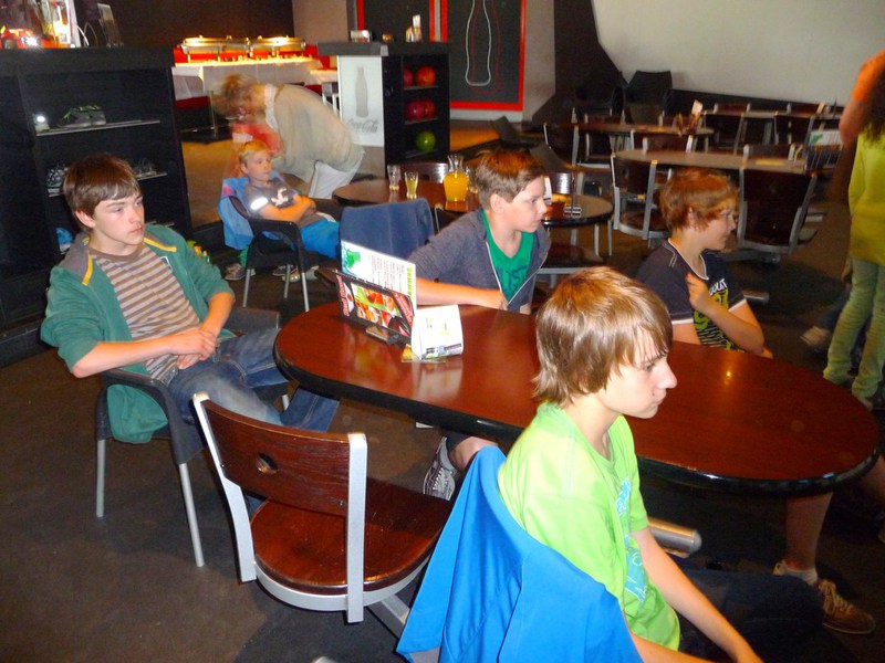 Die Pause war nur kurz, da alle Jugendlichen darauf drängten, endlich statt der sonst gewohnten kleinen Bälle die großen Bowlingkugeln gegen die Pins schmettern zu können. Nach einem kleinen Umweg durch eine falsch gewählte Abzweigung kam die Gruppe trotzdem noch pünktlich im Red Bowl an. Dort waren dann alle sehr eifrig bei der Sache. Selbst die Kleinen wuchteten Spiel für Spiel mit Begeisterung die doch recht schweren Kugeln auf die Bahn. Neben Getränken gab es zum Schluss für alle noch einen kleinen Imbiss, ehe die Siegerehrung auf dem Programm stand. Den ersten Platz erreichte mit 239 Punkten Simon Schnittger, Zweiter wurde mit 206 Punkten Joscha Cerny und Dritter Felix Rademaker mit 203 Punkten. Alle Sieger konnten sich über einen Geschenkgutschein der Firma Hornschu freuen. Gegen 18.00 Uhr traf die Gruppe dann wieder in Bünde ein und alle waren sich einig, die Veranstaltung im nächsten Jahr zu wiederholen.