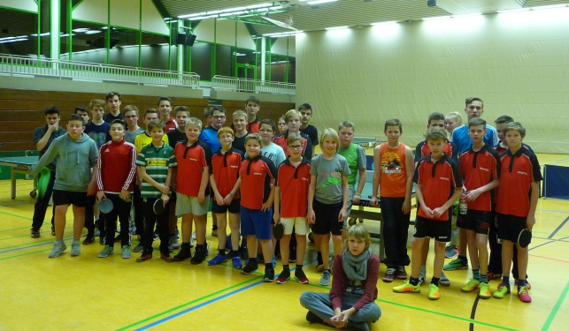 Schüler- und Jungenspieler der TT-Abteilung des BTW Bünde, die wie im Vorjahr in Form eines Rundlaufturniers durchgeführt wurde. 36 Spieler gingen in 9 Teams zu je 4 Spielern an den Start.