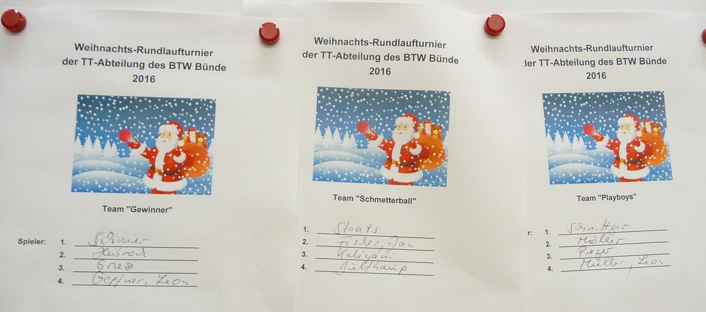 Nach den Spielen wurden zuerst diejenigen Spieler, die im Jahre 2016 am häufigsten am Training und den Meisterschafsspielen teilgenommen hatten, mit einer Urkunde und tollen Preisen belohnt. Platz 1 belegte hier Tim Leßmann gefolgt von Philipp Gerbersdorf und Wilhelm Gaab. Danach erfolgte die Siegerehrung. Die Siegerteams erhielten tolle Preise. Danach durften sich die nachfolgenden Mannschaften am Bescherungstisch aus dem reichhaltigen Angebot ebenfalls schöne Preise aussuchen. Neben den obligatorischen Süßigkeiten und Plätzchen konnten die Spieler wieder an einer sehr schmackhaften Pizza ihren Hunger und mit entsprechenden Getränken ihren Durst stillen.