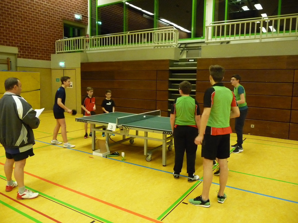 Gleich zu Beginn hatte er mit Alexander Gross (TTC Mennighüffen, TTR Wert 1.267) seine erste Bewährungsprobe zu bestehen. Mit viel Kampfgeist und auch ein wenig Glück entschied er dieses Spiel mit 3:2 und 12:10 im Entscheidungssatz für sich. Danach spielte er aber selbsbewußter auf und gewann relativ sicher die nachfolgenden Spiele gegen Finn Ewald (TuRa Elsen , TTR Wert 1.107), Luca Röder (TSV Eintracht Belle, TTR Wert 1.201) und Vitali Kasper (Post SV Gütersloh, TTR Wert 1.204) jeweils mit 3:1 und Magnus Jording (TTU Bad Oeynhausen, TTR Wert 1.138) mit 3:0, so dass er sich noch Hoffnungen auf den Gruppensieg machen konnte, obwohl er im letzten Spiel als Außenseiter gegen den mit einem TTR Wert von 1.615 hoch favorisierten Mattis Nienaber von der Spvg Steinhagen ins Spiel ging. Die ersten beiden Sätze gingen dann auch klar an Nienaber. Im dritten Satz erkämpfte sich Leßmann dann aber mit einer hervorragenden Leistung einen Sieg, ehe er den vierten Satz und damit das Spiel mit 3:1 verloren geben musste. Trotzdem freute er sich zusammen mit seinem anwesenden Vater und Abteilungsleiter Dieter Früchtel über sein hervorragendes Abschneiden und das Erreichen der Endrunde der Bezirksrangliste am 25.5.2017 in Paderborn.
