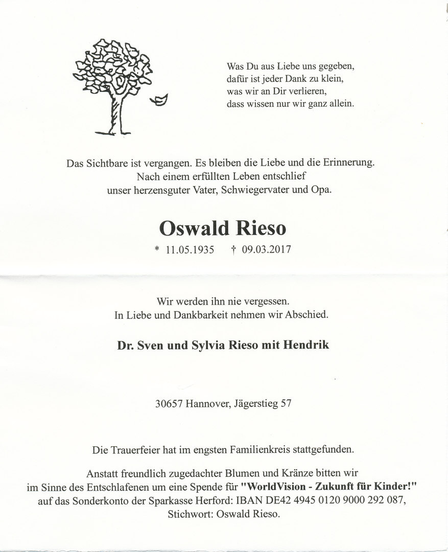 Oswald Rieso verstorben |