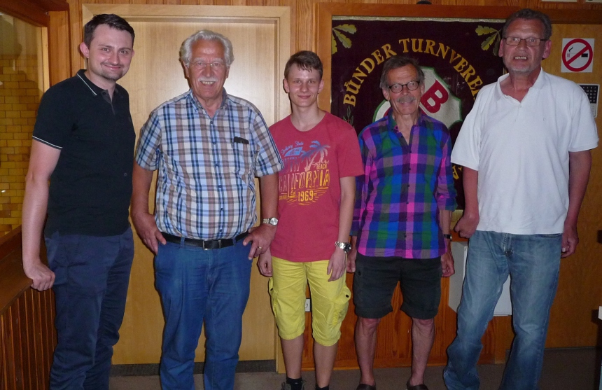 Der neue Abteilungsvorstand von links: Damian Schwarz (Abteilungsleiter) Dieter Früchtel (ehemaliger Abteilungsleiter, Pressewart) Florian Rademaker (stellv. Abteilungsleiter) Peter Spatzl (Jugendwart) und Hans-Hermann Schürmeier (Kassenwart).