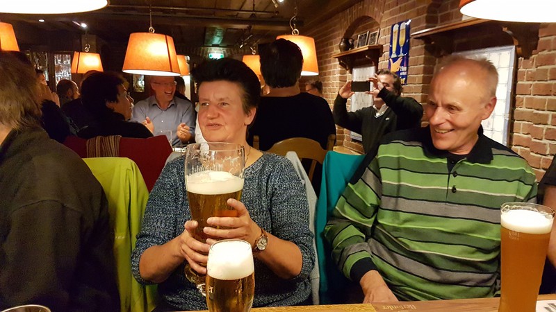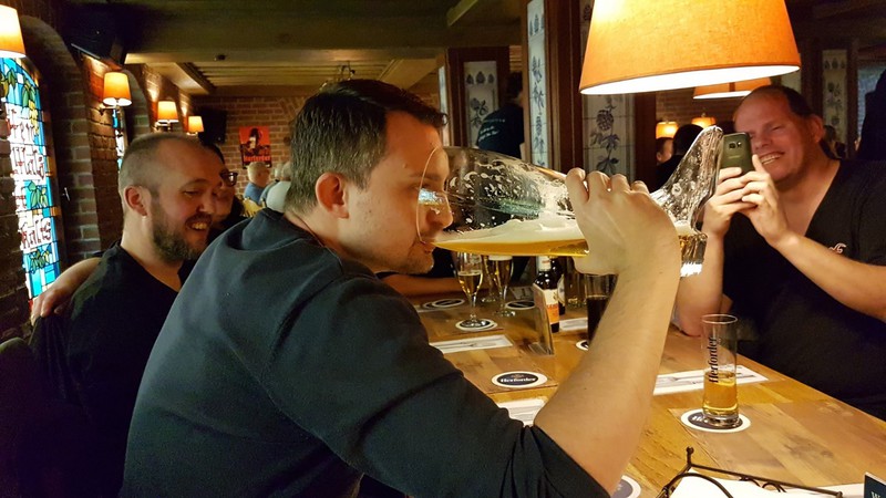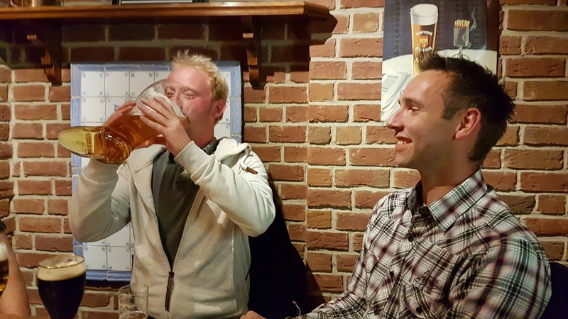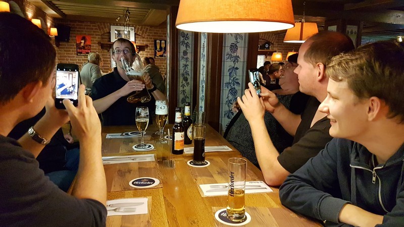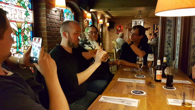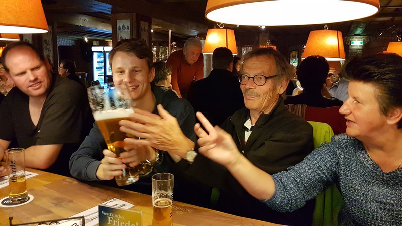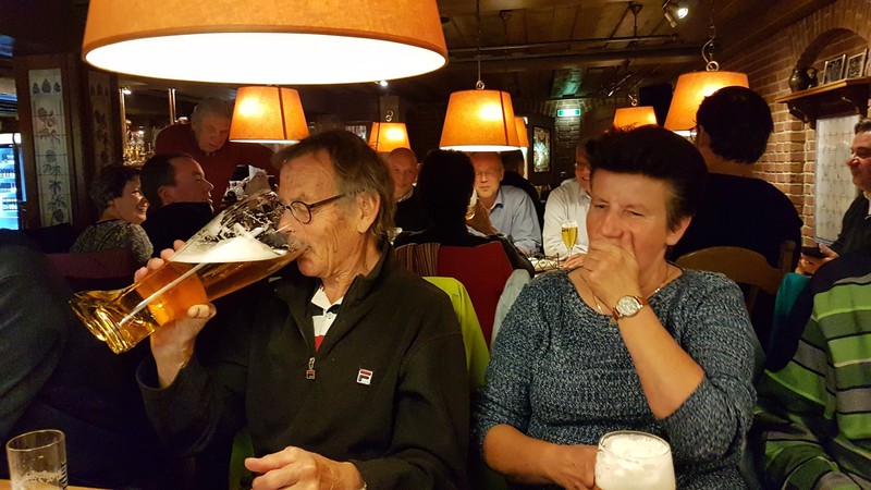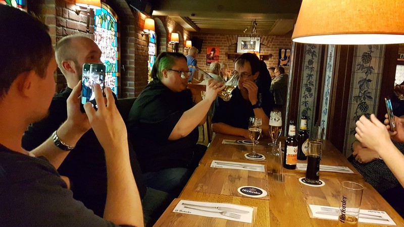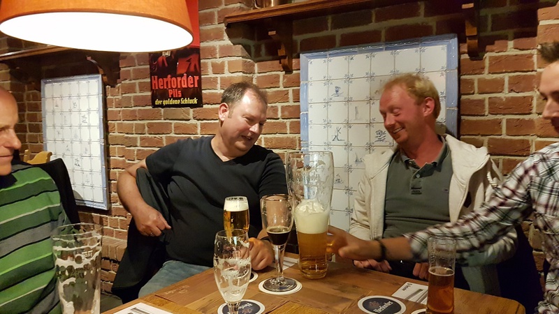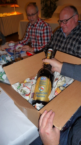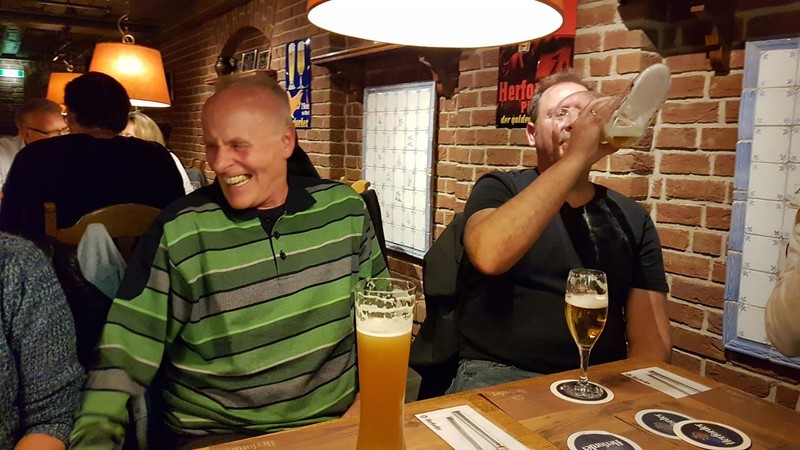 Nach der interessanten Betriebsbesichtigung hatte die Brauerei zu einem westfälischen Buffet mit Umtrunk eingeladen. Dabei galt es unter anderem, die überaus großen Bierstiefel zu leeren. Dies erforderte schon eine gewisse Kunstfertigkeit, wurde aber von den meisten Teilnehmern der Veranstaltung bravourös bewältigt. Zur Erinnerung an den schönen und fröhlichen Abend durfte jeder Teilnehmer noch ein Herforder Bierglas als Souvenier mit nach Hause nehmen.