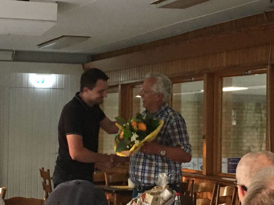 Damian Schwarz (links) überreicht dem scheidenden Abteilungsleiter Dieter Früchtel einen Blumenstrauß für seine Frau