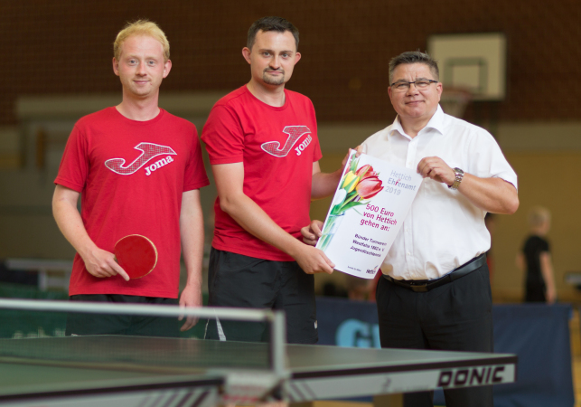 Eine großzügige Spende in Höhe von 500,- € erhielt die Tischtennisabteilung des BTW Bünde von der Fa. Hettich. Die symbolische Übergabe des Schecks erfolgte in der Sporthalle des Gymnasiums am Markt am 9.7.2019 durch den Abteilungsleiter der Disposition der Hettich Heinze GmbH & Co. KG, Michael Tilgner, in Gegenwart von Jugendtrainer Alexander Beel und Abteilungsleiter und Nachwuchsbetreuer Damian Schwarz, der bei der Fa. Hettich arbeitet und die Spende aufgrund seines Engagements in der Tischtennisabteilung initiiert hat.