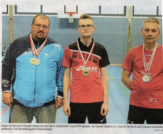 Einen herausragenden Erfolg erzielte Viktor Görlitz bei den Kreismeisterschaften 2019, die in diesem Jahr vom TuS Bardüttingdorf-Wallenbrück durchgeführt wurden. Nach relativ klaren Siegen gegen Friedhelm Stallmann (3:1) und Sascha Lorkowski (3:0) stand er im Halbfinale Carsten Sundmäker vom gastgebenden TuS Bardüttingdorf-Wallenbrück gegenüber. Hier bewies er große Nervenstärke, denn das Spiel stand bis zuletzt auf Messersschneide. Nach verlorenem erstem Satz gewann Viktor Görlitz den zweiten, verlor den dritten und gewann den vierten. Im fünften Satz kämpfte er aufopferungsvoll, brachte diesen ganz knapp mit 11:9 nach Hause und konnte sich damit das Finale sichern. Im Finale hatte er dann keine Schwierigkeiten mehr, siegte sicher mit 3:0 über Daniel Lübben und konnte sich damit über den Meistertitel der Klasse D (bis Q-TTR 1.400) freuen. Mit seinen Leistungen unterstrich er eindrucksvoll seinen seit Monaten anhaltenden Formanstieg, der ihm auch in den laufenden Meisterschaftsspielen bereits zu mehreren spektakulären Siegen im oberen Paarkreuz der 1. Kreisklasse verholfen hat.