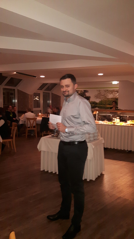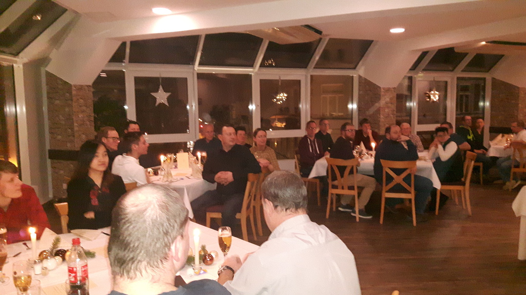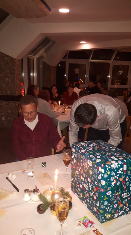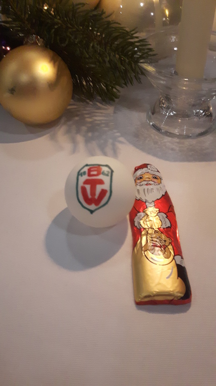 Der stellvertretende Abteilungsleiter, Florian Rademaker, hatte sich als besondere Überraschung einen Tischtennisball als Platzkarte ausgedacht, den er in mühevoller Arbeit für die 41 Teilnehmer mit dem Logo des BTW und dem Spielernamen bemalt hatte. Wie immer hatte der Gastronom Finkemeyer die Speisen toll arrangiert und schmackhaft zubereitet. Nach dem Essen fand wieder das Geschenkewichteln statt, welches allen Beteiligten aufgrund der teilweise sehr witzigen Geschenke und der Möglichkeit, ein nicht zusagendes Geschenk gegen ein anderes zu tauschen, viel Spaß bereitete. Den Hauptpreis des Abends gewann beim Würfeln Kresimir Rubil. Wie immer ging der feuchtfröhliche Abend erst spät nach Mitternacht zu Ende.