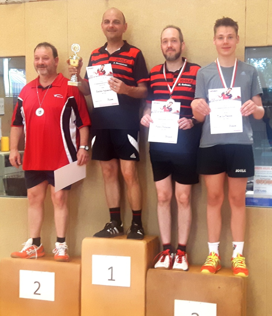 Dank eines Freiloses in der K.O- Runde und eines 3:1 Sieges im Viertelfinale erreichten beide ungefährdet das Halbfinale. Auch dort verlor nur Markus Radmann ein Einzel, so dass der Einzug ins Finale mit 3:1 gesichert war. Im Finale ließen dann die Kräfte und die Konzentration von Markus Radmann nach und er konnte kein Einzel mehr gewinnen. Dafür trumpfte Thomas Gibert groß auf und gewann beide Einzel. Da auch das Doppel gewonnen wurde, standen beide Spieler mit 3:2 Siegen als Turniersieger fest. Beide waren ohne große Erwartungen in das Turnier gegangen und standen umso glücklicher gegen 23.30 Uhr auf dem Siegertreppchen und nahmen die Glückwünsche, die Siegerurkunde und den Hauptpreis des Turniers entgegen.