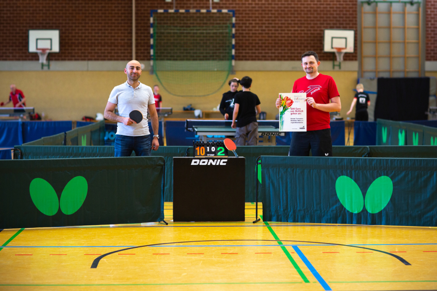 Hambardzumyan, in Gegenwart von Abteilungsleiter und Nachwuchsbetreuer Damian Schwarz, der bei der Fa. Hettich arbeitet und die Spende aufgrund seines Engagements in der Tischtennisabteilung