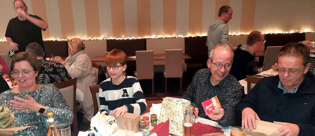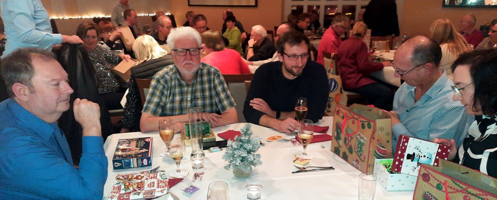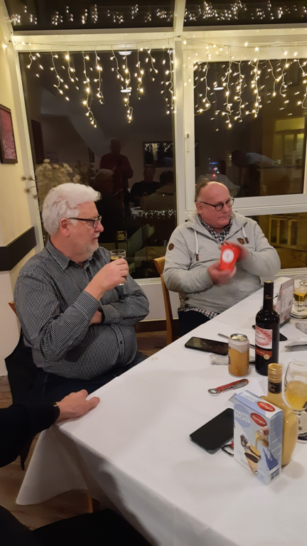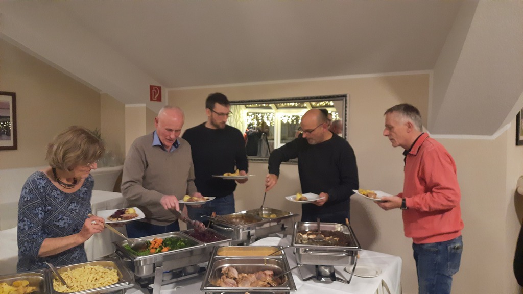 Das Buffet war vom Gastronomen Finkemeyer wieder sehr umfangreich, toll arrangiert und schmackhaft zubereitet worden. Nach dem Essen fand das traditionelle Geschenkewichteln statt, Das Wichteln stand diesmal unter dem Motto "Internationale Getränke". Die Teilnehmer der Veranstaltung konnten sich jeweils ein verpacktes Geschenk erwürfeln und nach dem Auspacken in zwei weiteren Würfelrunden bei Nichtgefallen gegen ein anderes Geschenk tauschen. Wie immer machte das Tauschen allen Beteiligten viel Spaß. Den Hauptpreis des Abends gewann beim Würfeln Kassenwart Hans-Hermann Schürmeier. Wie immer ging die Veranstaltung erst spät am Abend zu Ende.