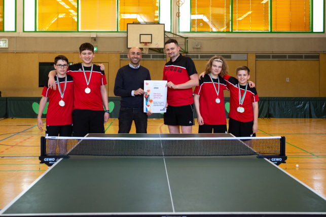 Tischtennisabteilung initiiert hat. Bei der Übergabe waren auch die Spieler Lennart Hasse, Kimi Lühr, Justus Helsberg und Bastian Grospitz (es fehlt Fynn Engelke) aus der