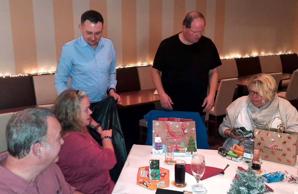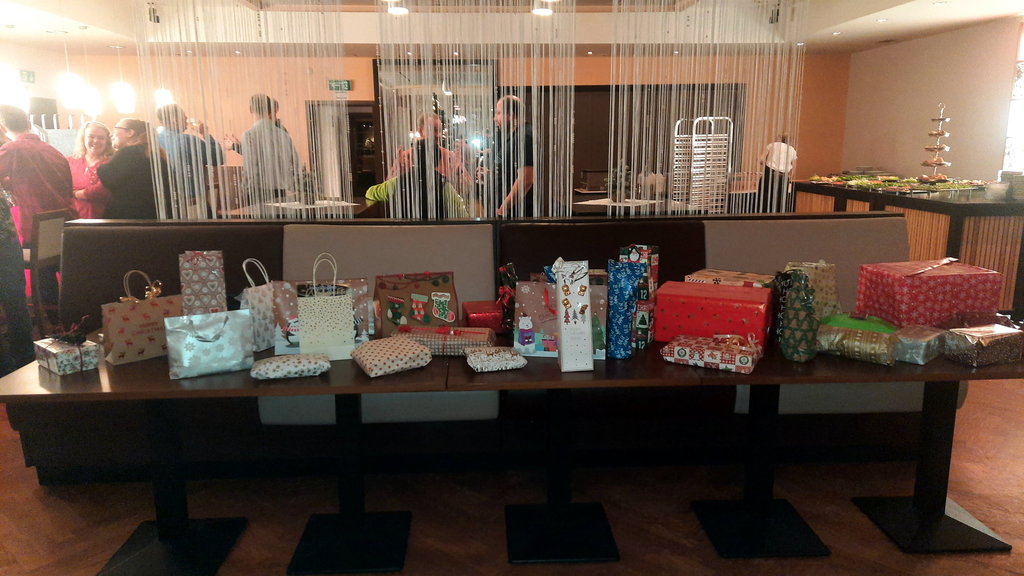 Nach dem Essen fand wieder das traditionelle Geschenkewichteln statt, Das Wichteln stand diesmal unter dem Motto "Süßes und Herzhaftes". Die Teilnehmer der Veranstaltung konnten sich jeweils ein verpacktes Geschenk erwürfeln und nach dem Auspacken in zwei weiteren Würfelrunden bei Nichtgefallen gegen ein anderes Geschenk tauschen. Wie immer machte das Tauschen allen Beteiligten viel Spaß, so dass die Veranstaltung erst spät am Abend zu Ende ging.