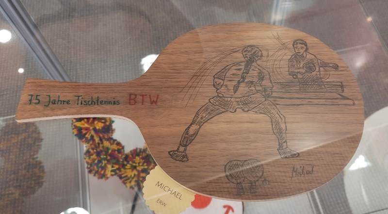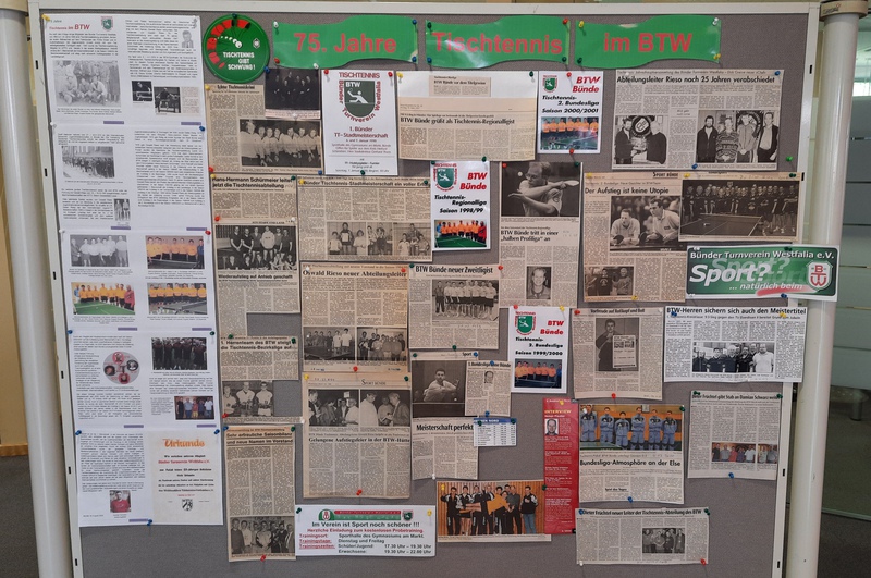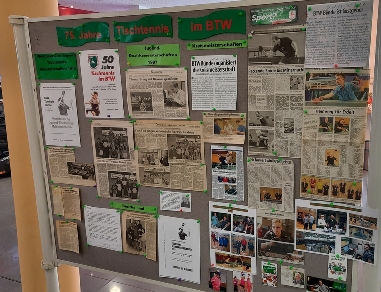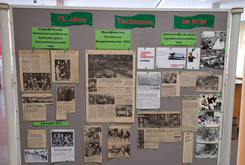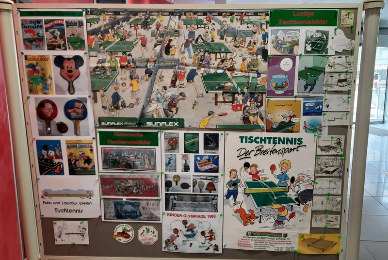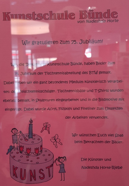 auf mehreren Stellwänden einen Überblick über die ihre geschichtliche Entwicklung mit zahlreichen Höhepunkten und Tiefen gibt sowie tischtennisbezogene kleine Kunstwerke der Kunstschule Bünde Bünde präsentiert.