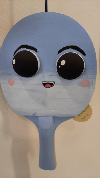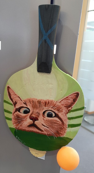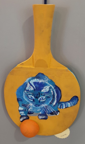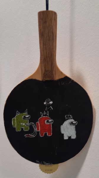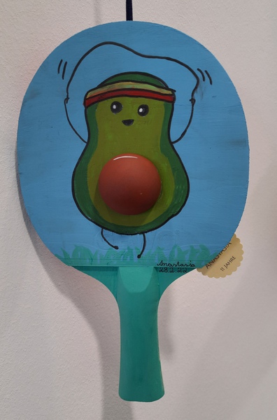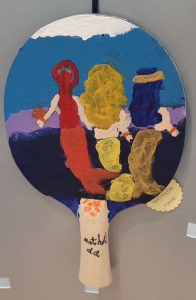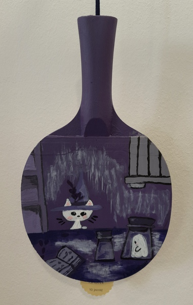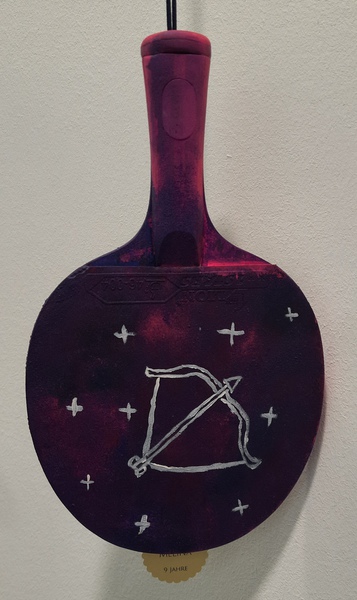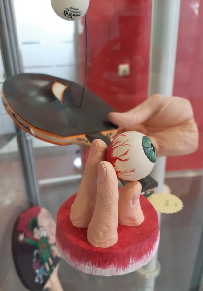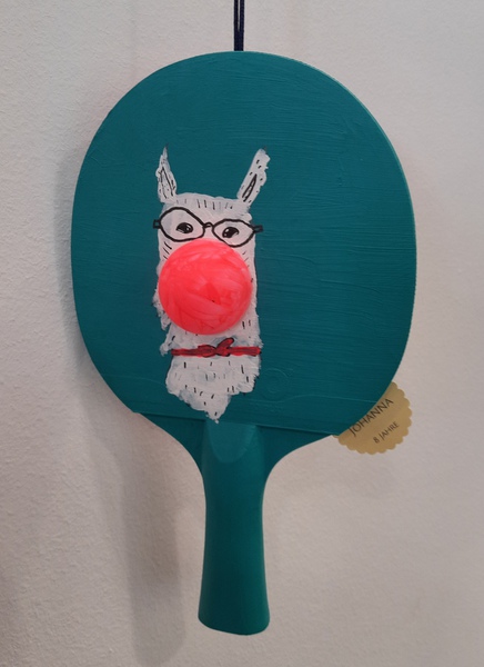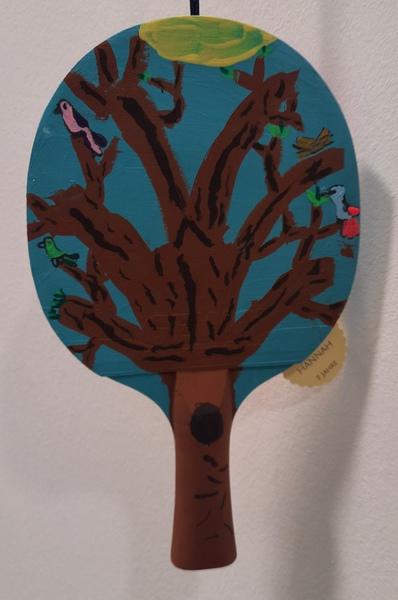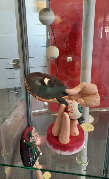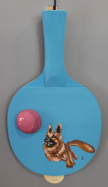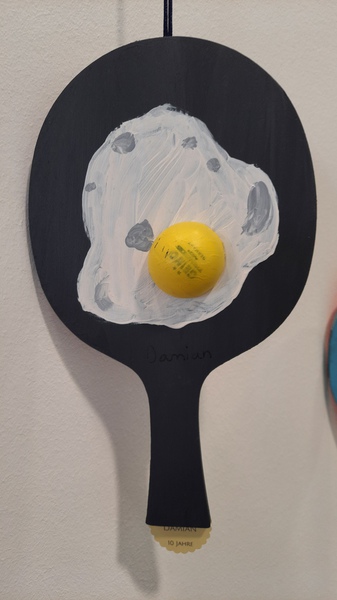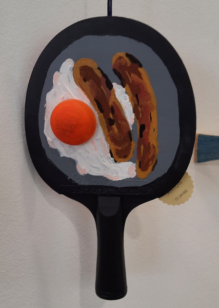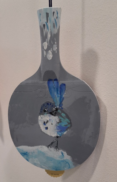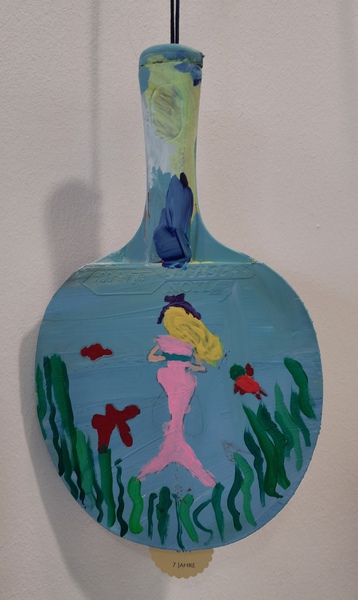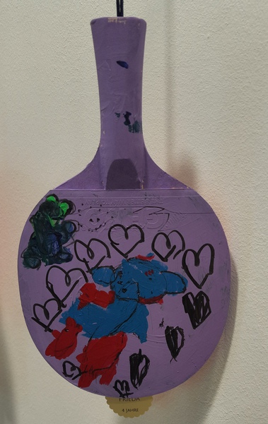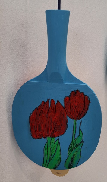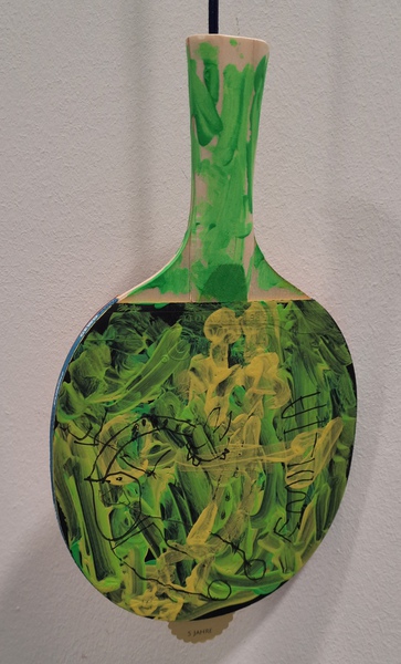 Anlass haben die Schüler*innen der Kunstschule Bünde fleißig Tischtennisschläger bemalt. Dabei sind auch Objekte entstanden, wie beispielsweise eine Hand, die einen Tischtennisschläger hält. Die